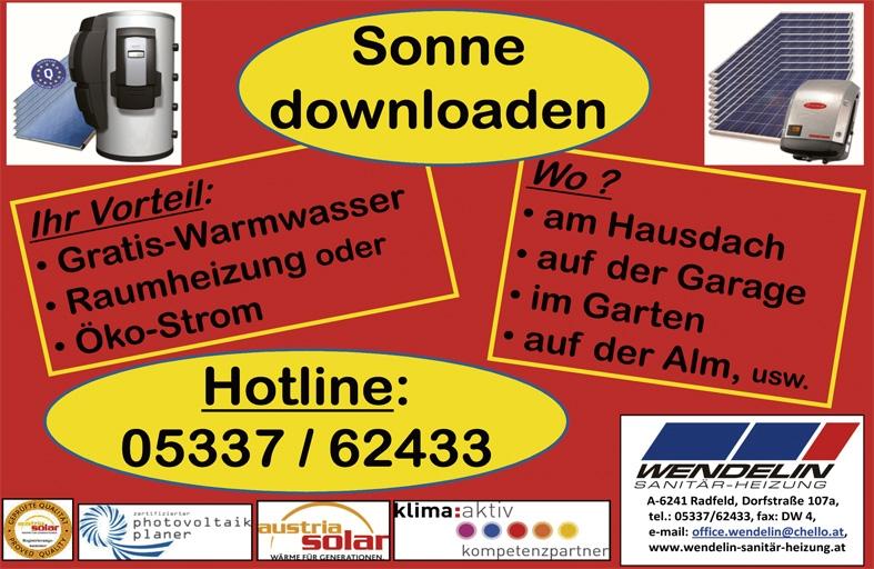 Mo - Fr: 8:00h-12:00h sowie an den Nachmittagen nach telefonischer Vereinbarung. Im akuten Notfall erreichen Sie uns telefonisch.Ob Warmwasser, Heizen oder Klimatisieren – wir finden Ihre optimale Sonnen-Energie-Lösung. Die erneuerbare Energie–Zukunft hat schon begonnen und ist unabhängig, sicher, verlässlich und effizient.